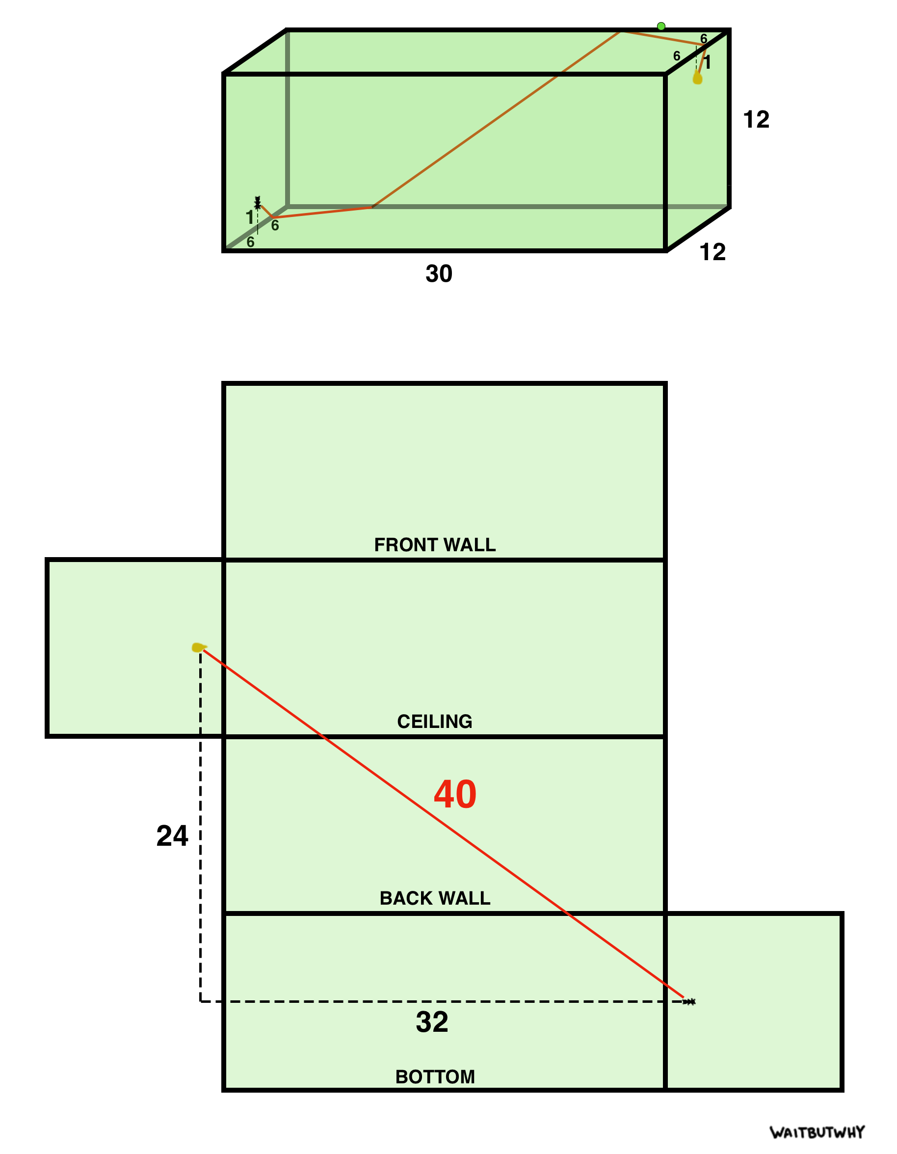 An ant is inside the box, 1 cm from the bottom, and wants to go eat the drop of honey on the opposite side, 1 cm from the top. Both the ant and the honey are exactly 6 cm from the walls. Crawling on inside of the box, what’s the shortest distance the ant can crawl to get to the honey?
